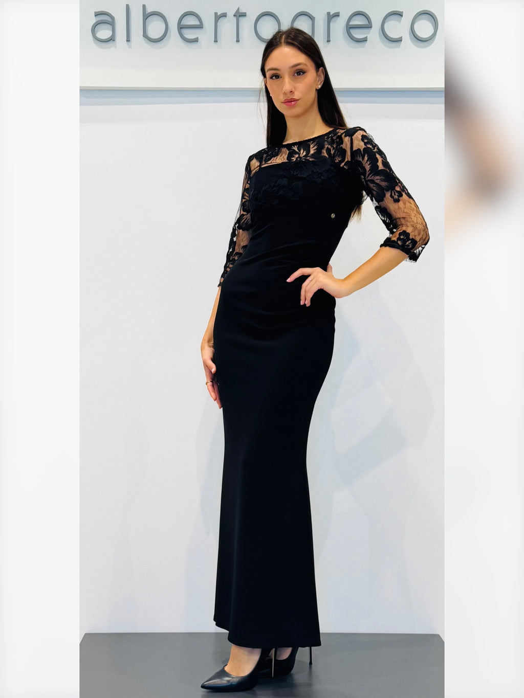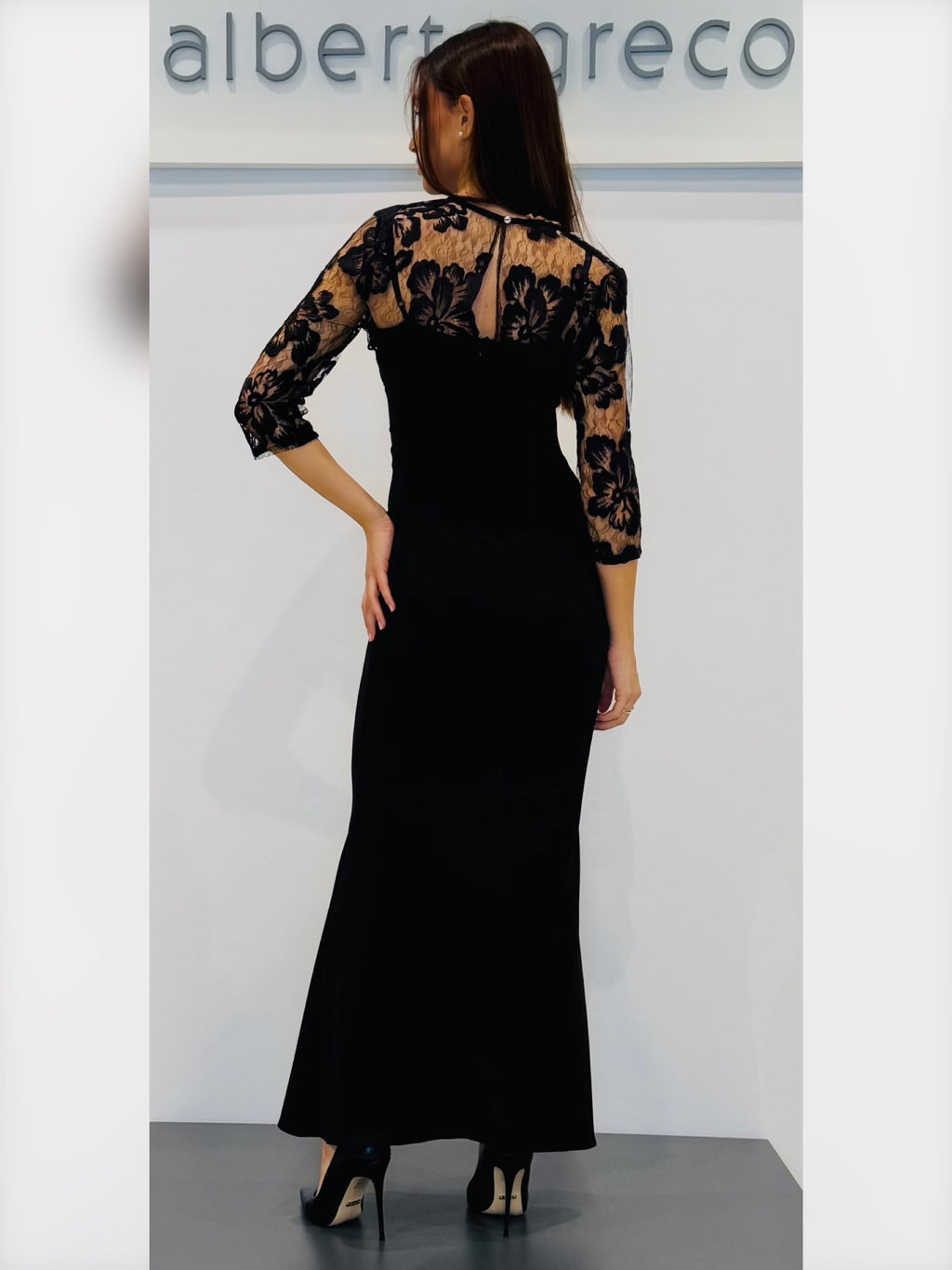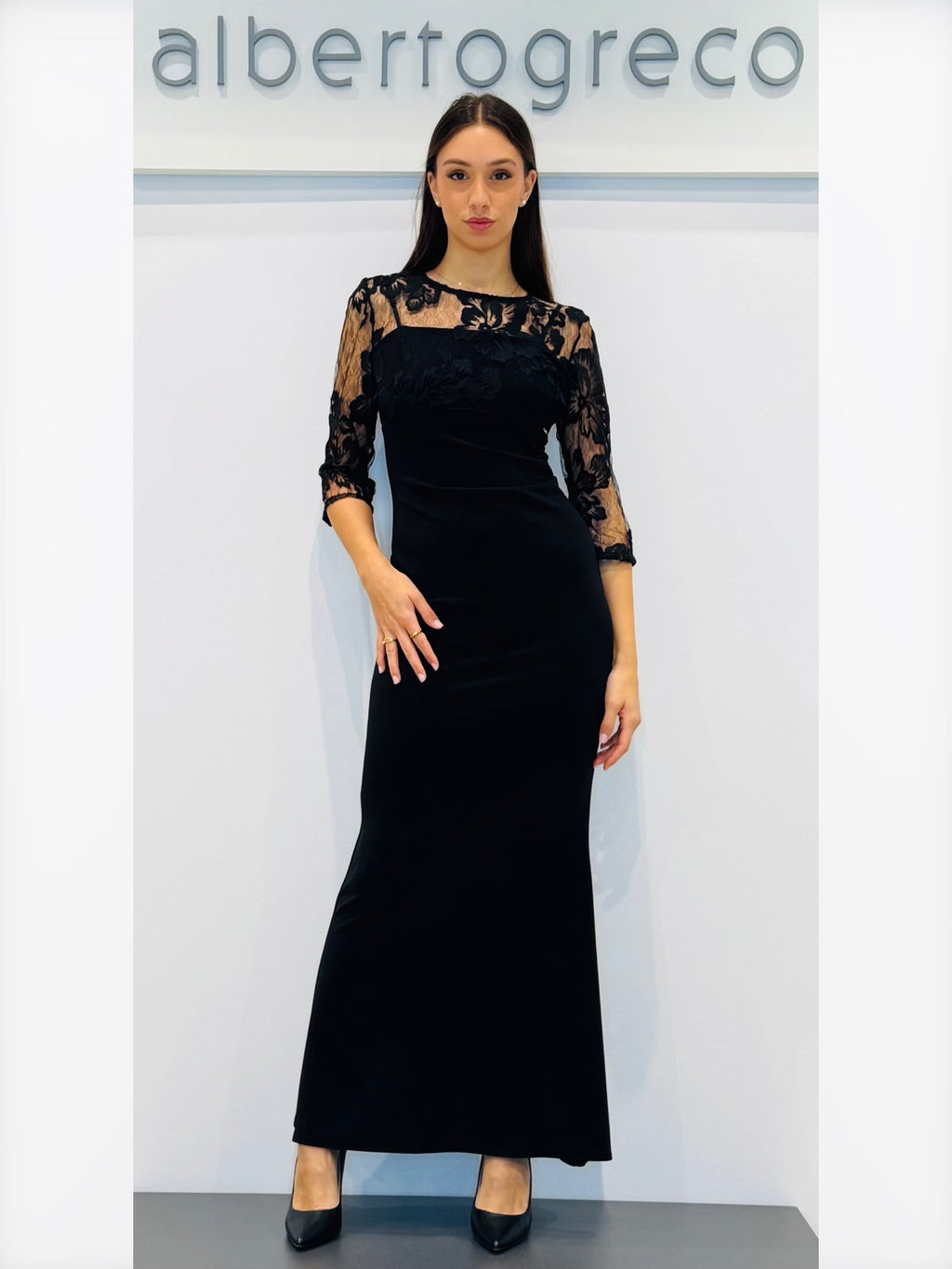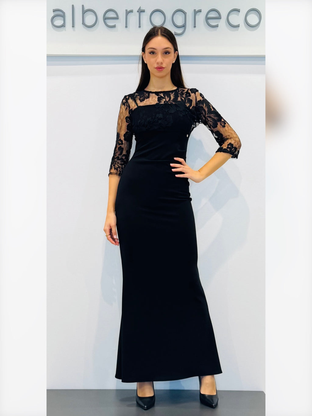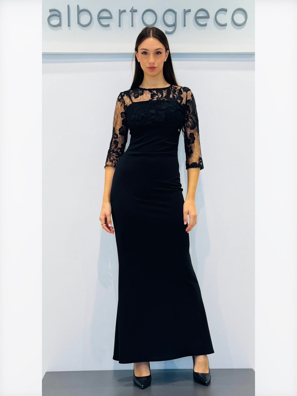 Abito con coretto in pizzo girocollo, con manica a tre quarti.