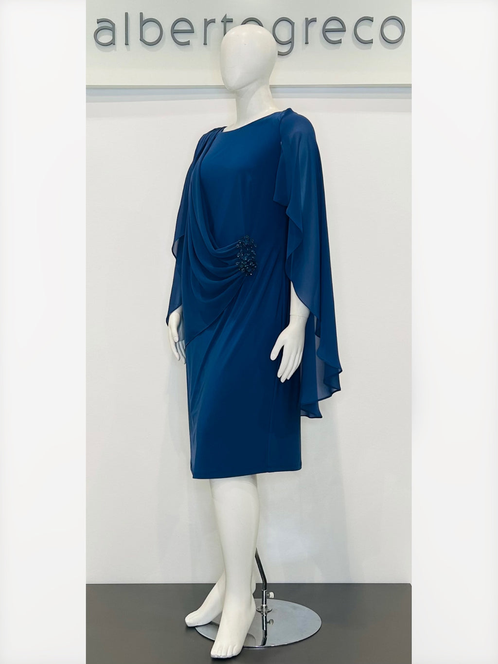 Abito con drappeggio in georgette che crea manica e mantella su dietro