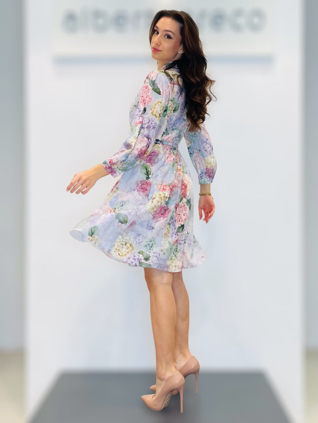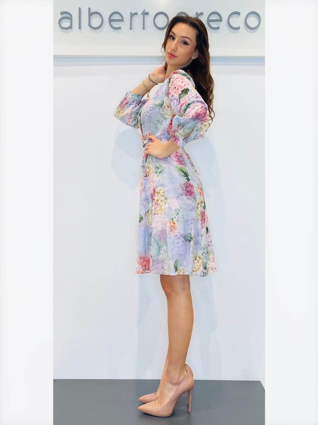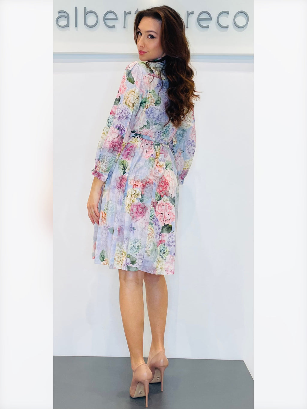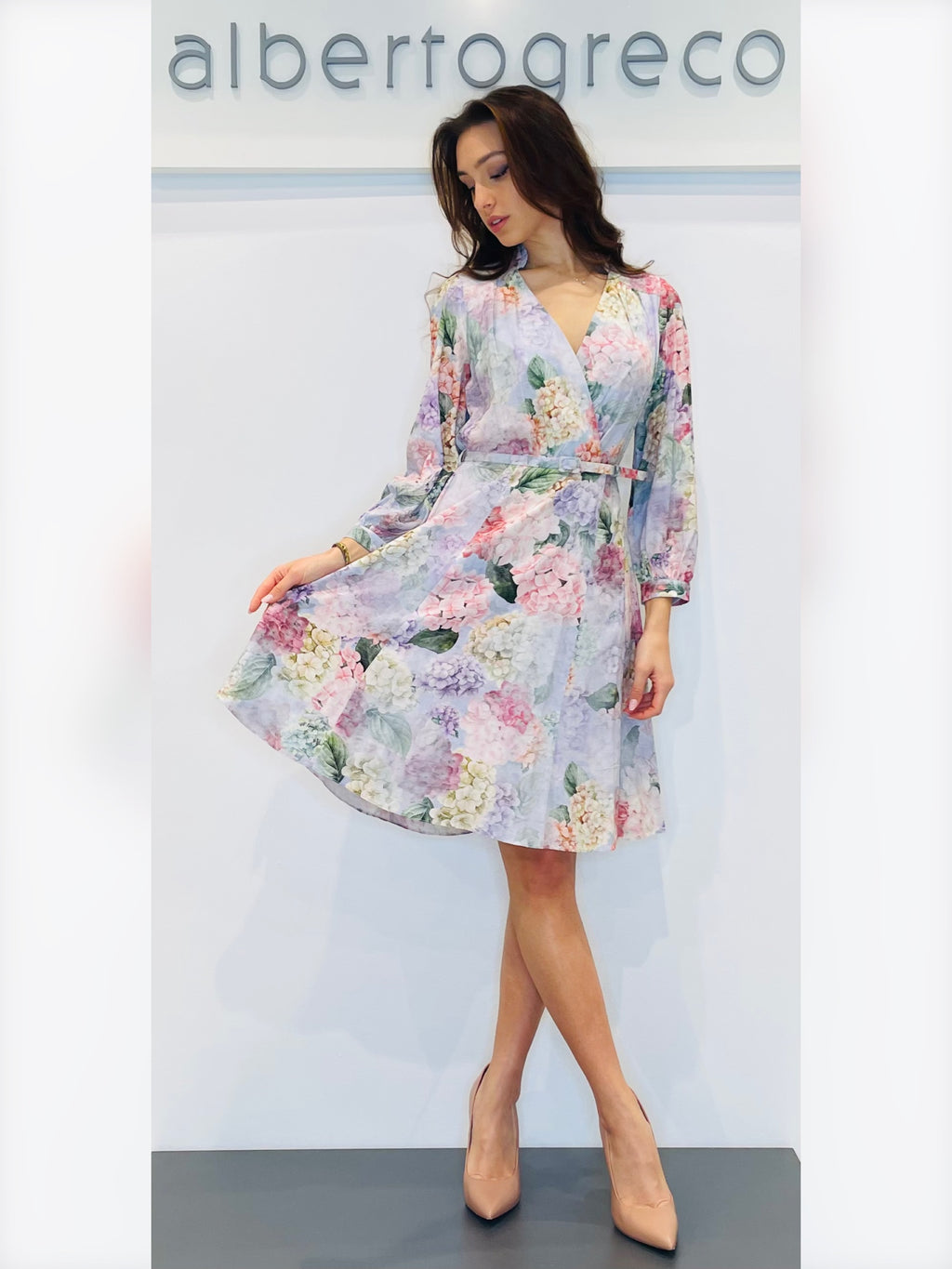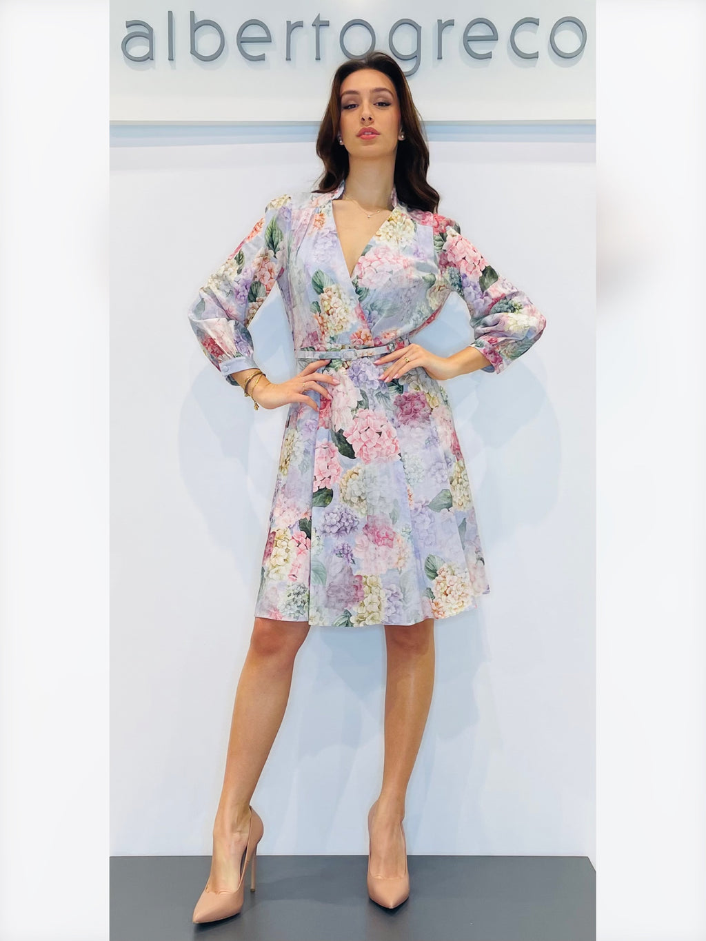 Abito corto con manica lunga in misto viscosaVestibilità regolare con vita elasticizzata dietroScollo a V incrociato, con manica lunga con polsino con bottoniCon cinturino in vita e gonna foderata Lavare a 30°Tessuto 85%VI 15%LIMade in Italy
