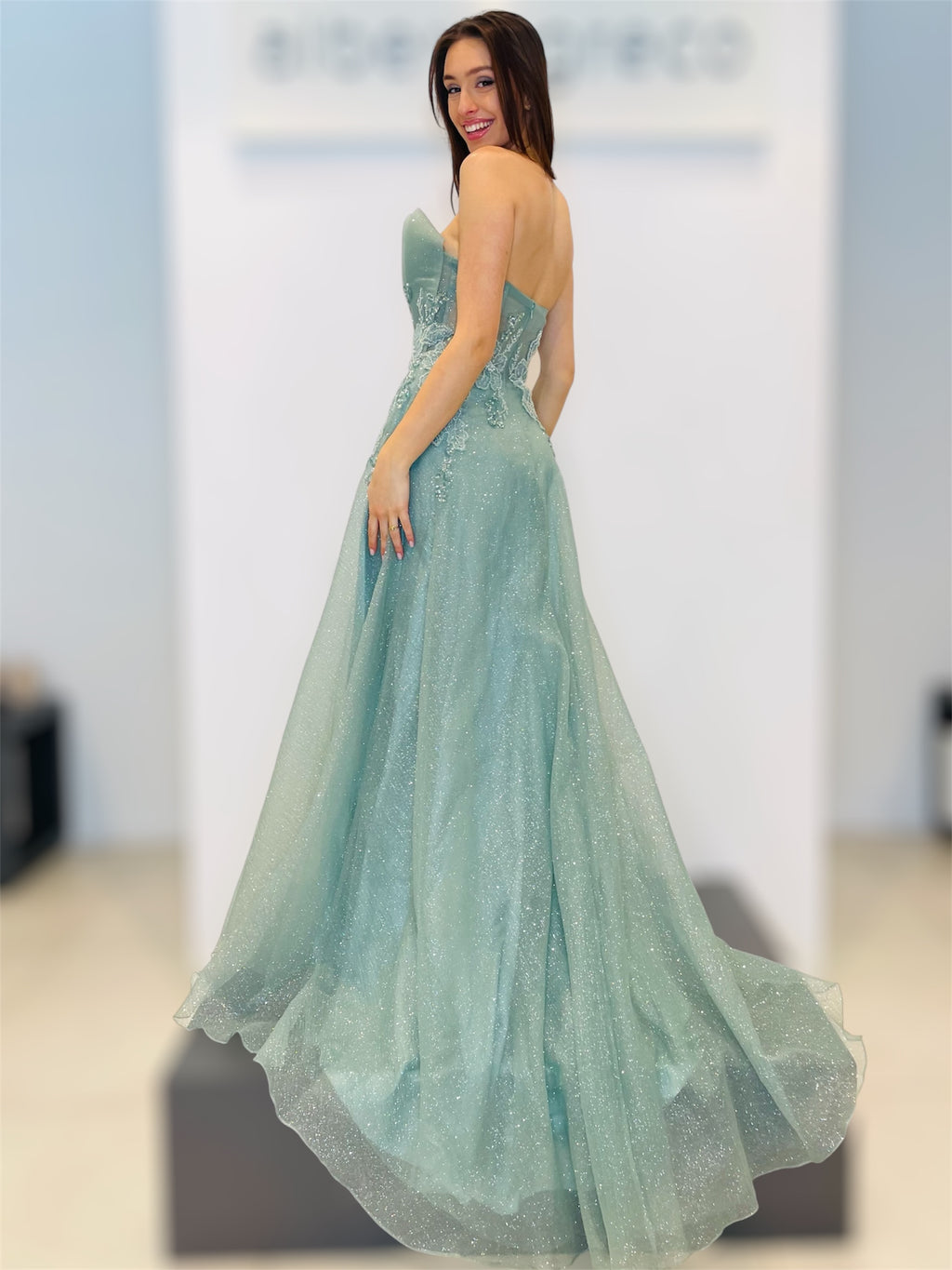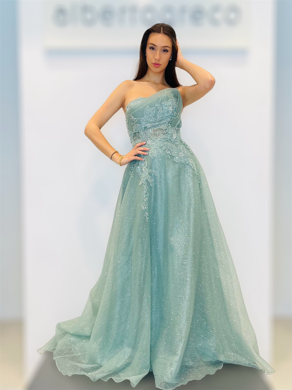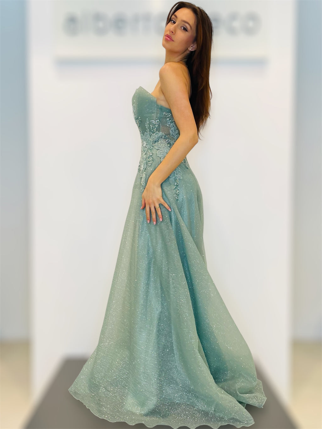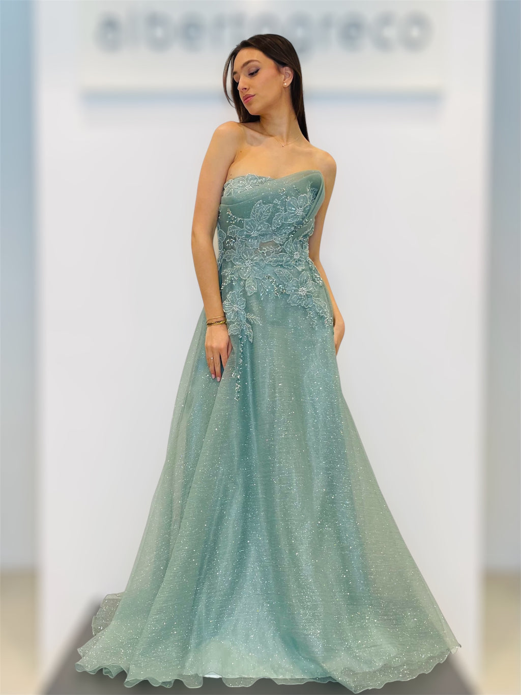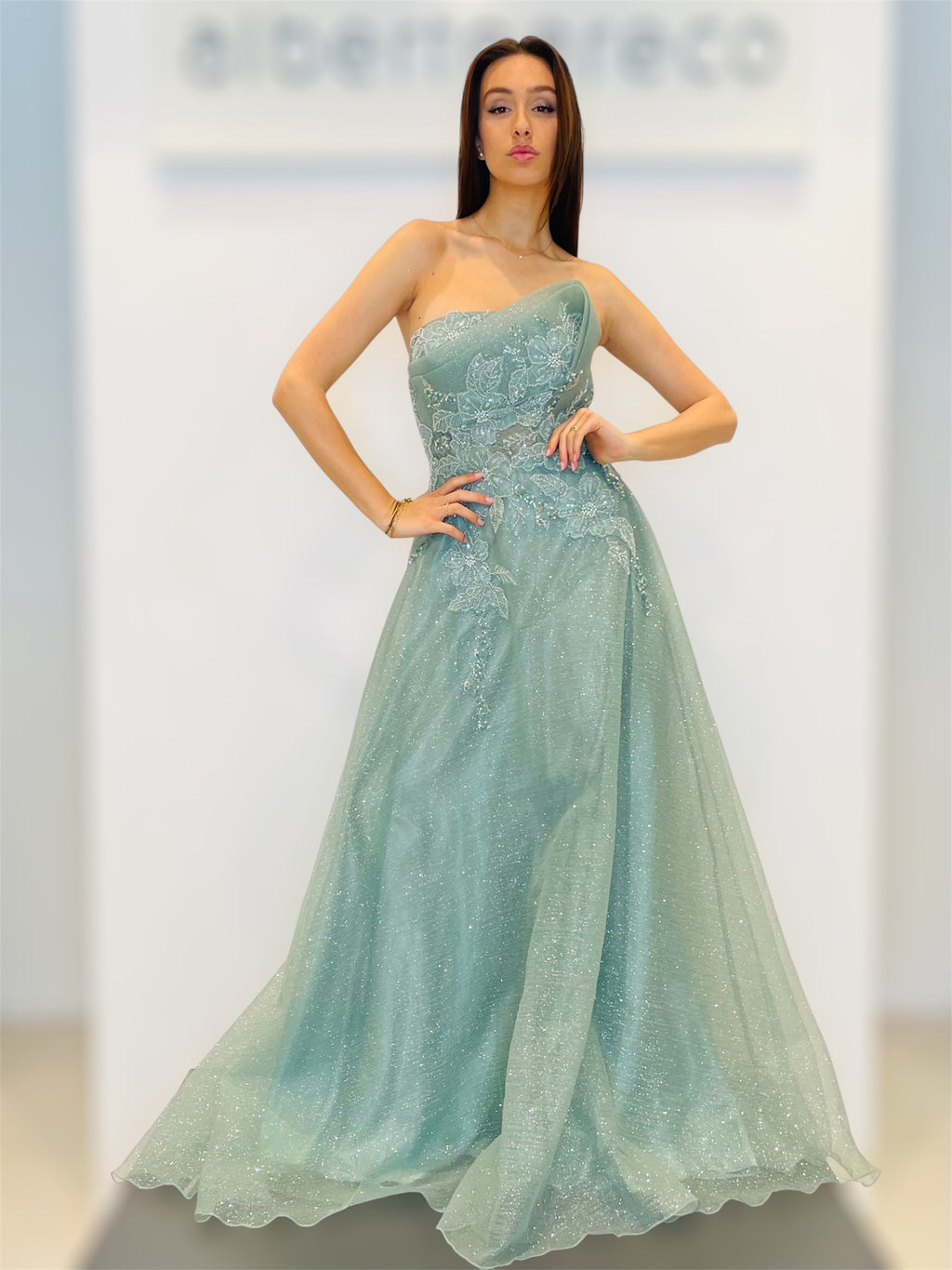 Vestibilità aderente regolareScollo a cuore, con bustino ricamato con coppetteZip nel centro dietroAbito con stola in tulleLavare a secco con idrocarburi in lavanderie specializzateTessuto 100%PL Fodera 100%PL
