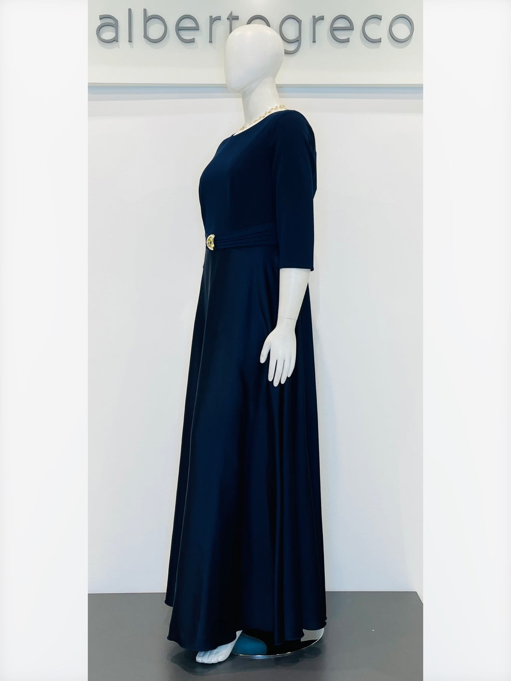 Scollo a barchetta, corpetto con cintura drappeggiata e manica a tre quarti