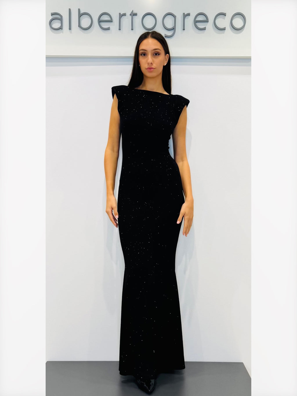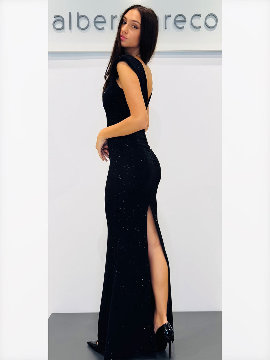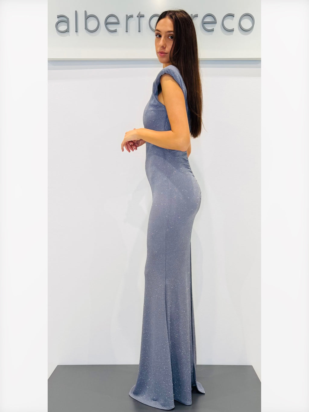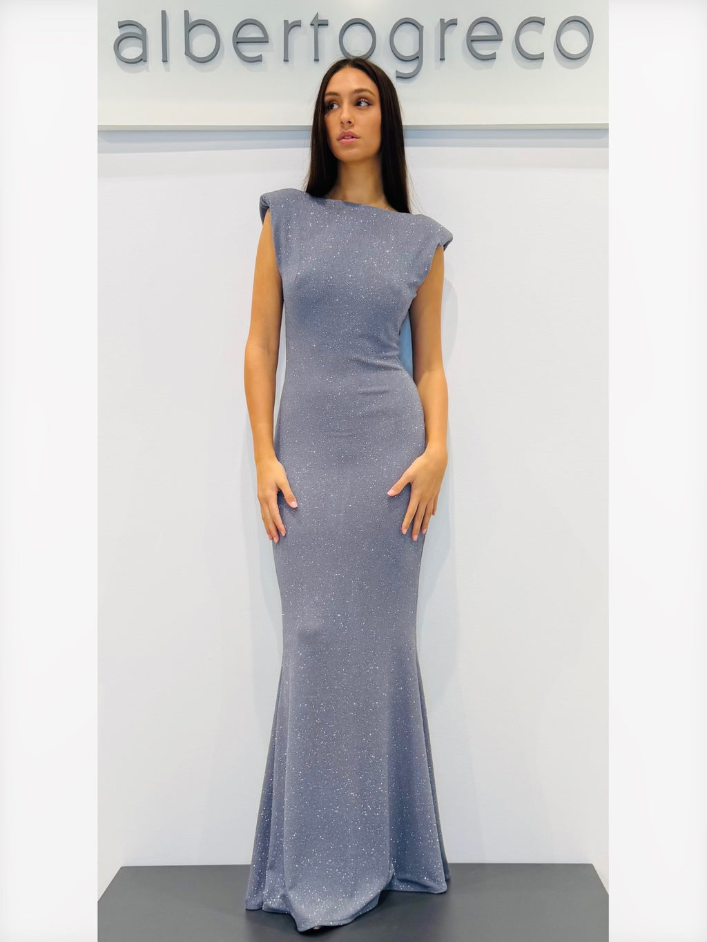 Abito lungo in jersey glitterato con scollo dietro