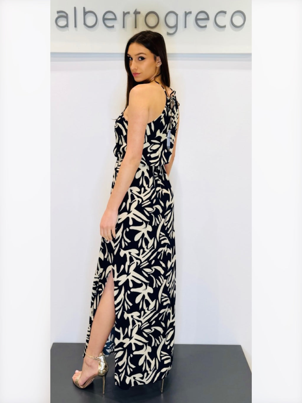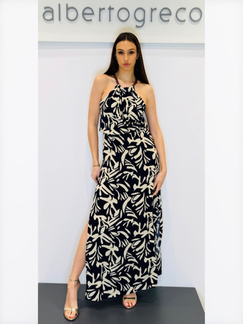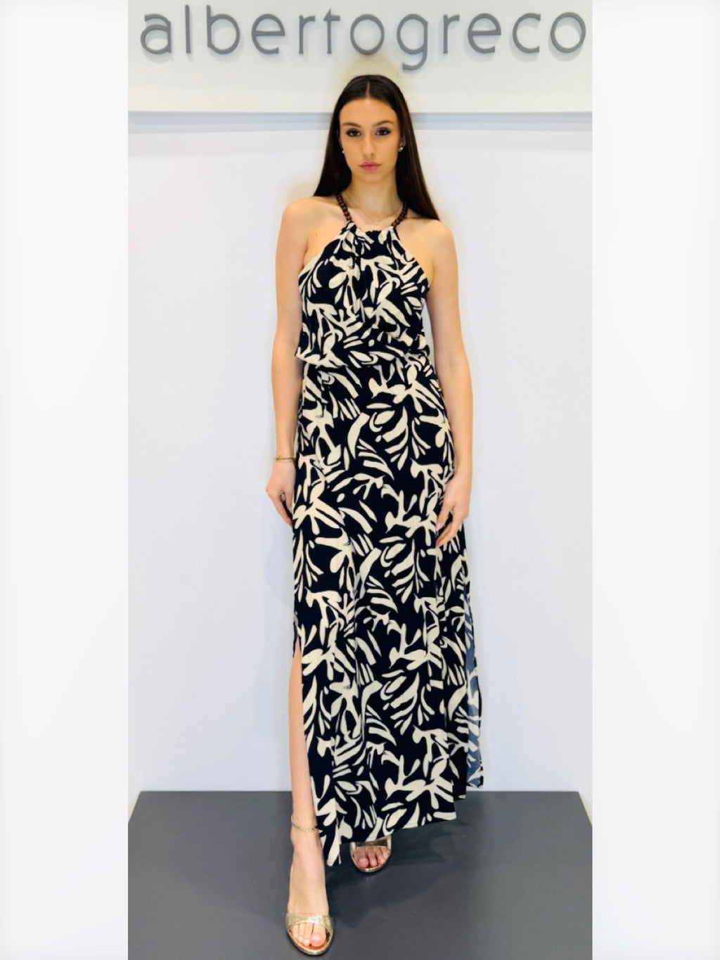 Abito lungo fantasia con scollo all'americana