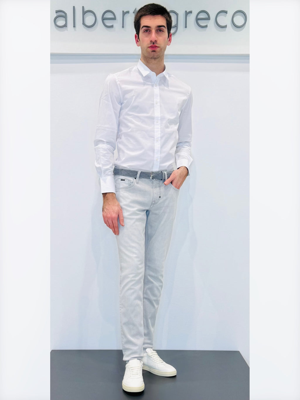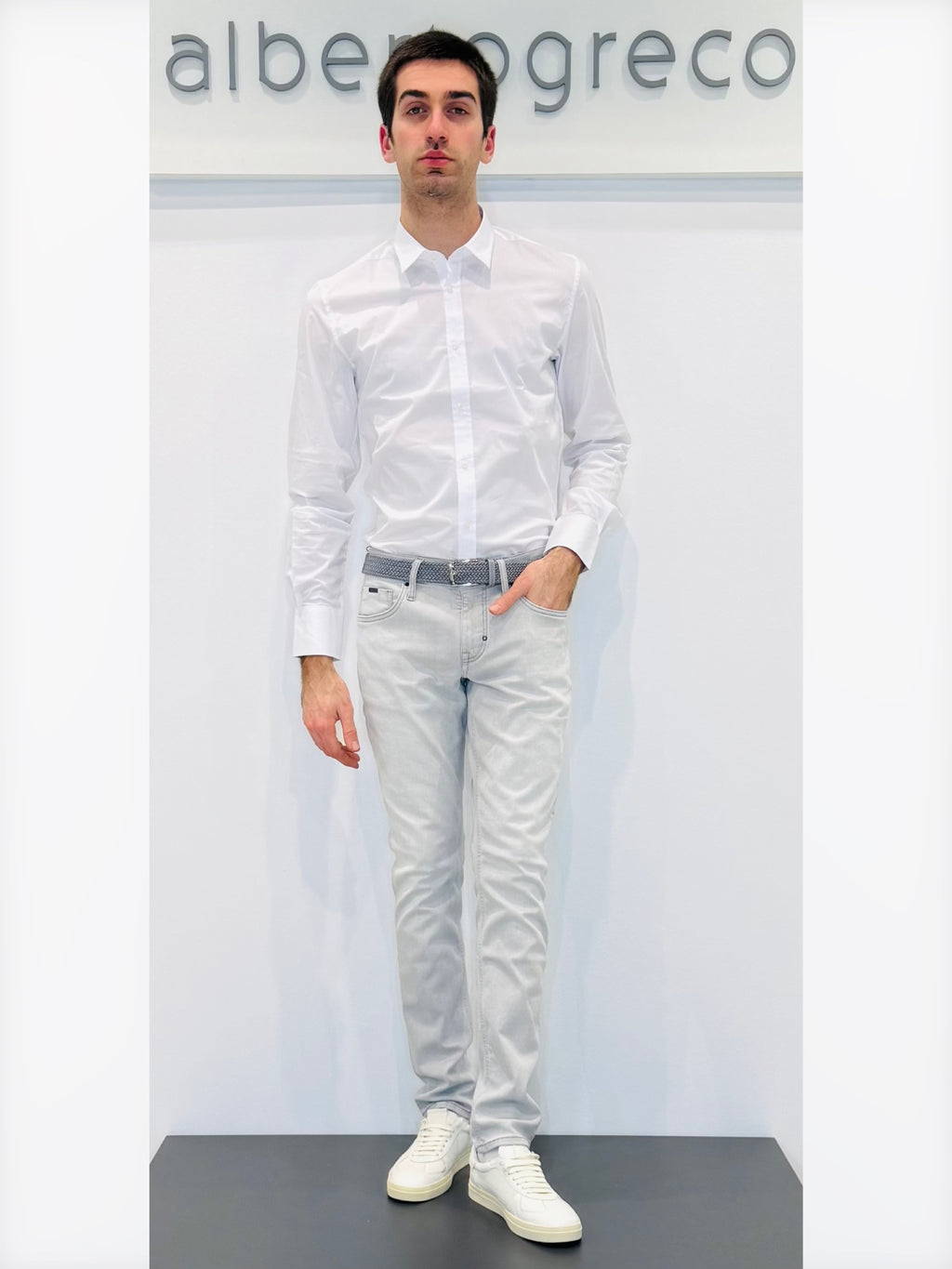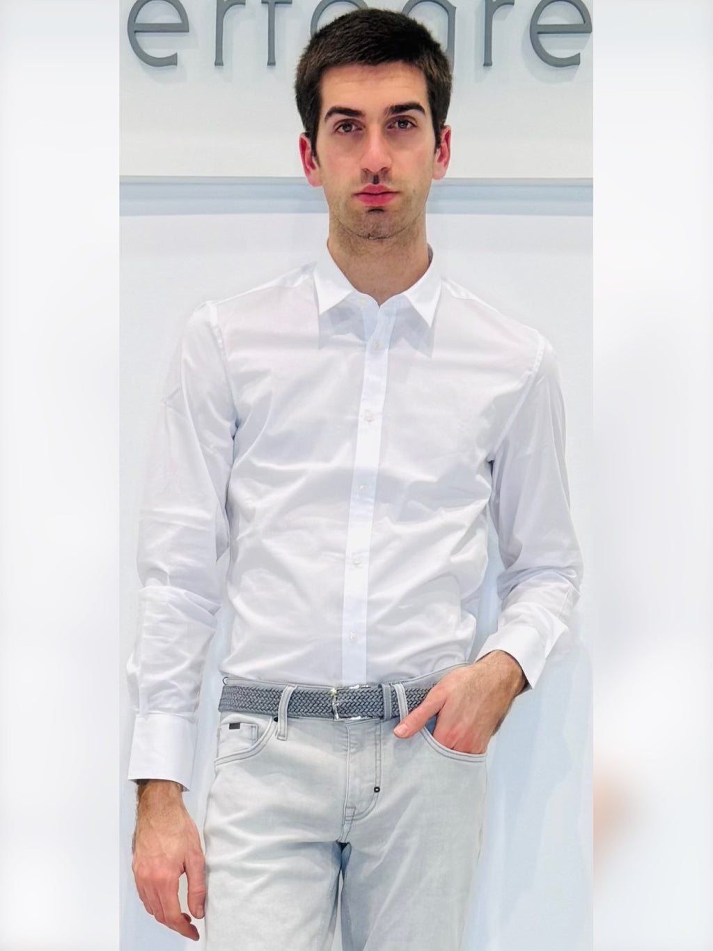 Camicia uomo aderente in cotone elasticizzatoVestibilità super slim Polso con angoli smussati e due bottoniCollo italiano piccoloAbbottonatura a vistaLavare a 30°Tessuto 74%CO 23%PA 3%EA
