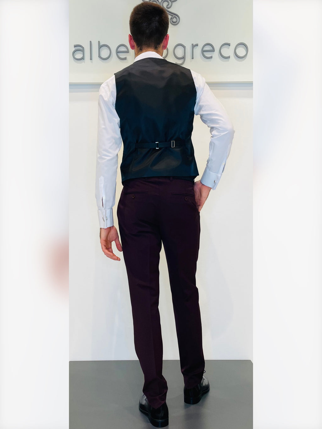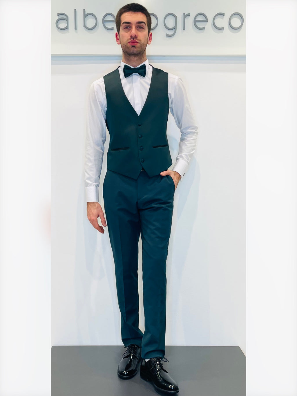 Completo formato da giacca stile mezzo tight, pantaloni e gile, cravattone o papillon