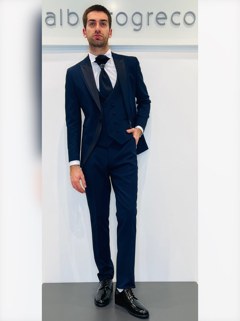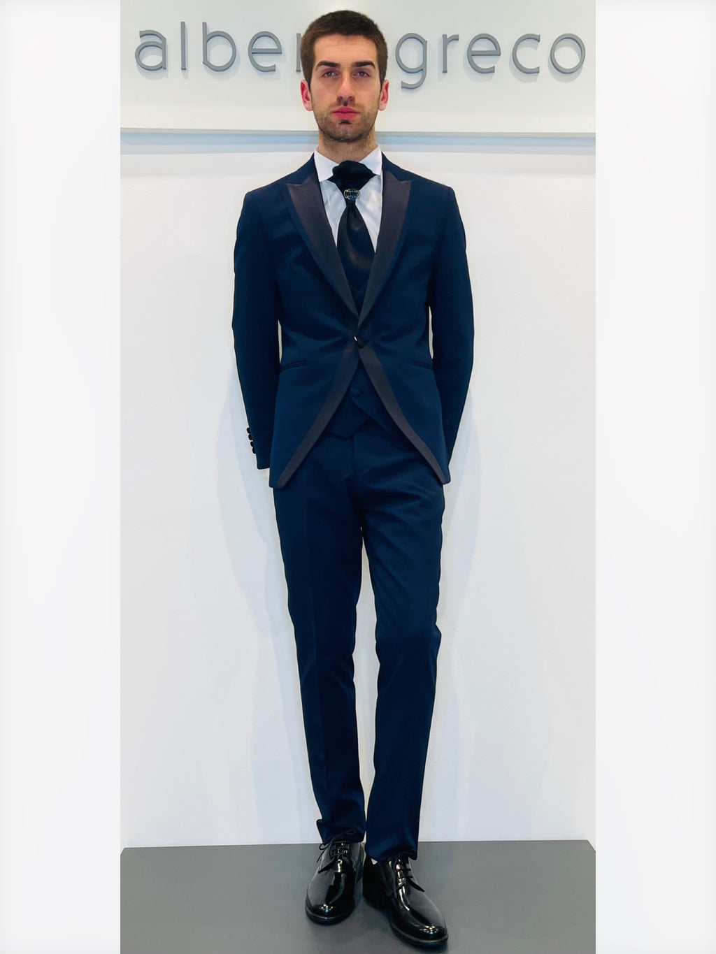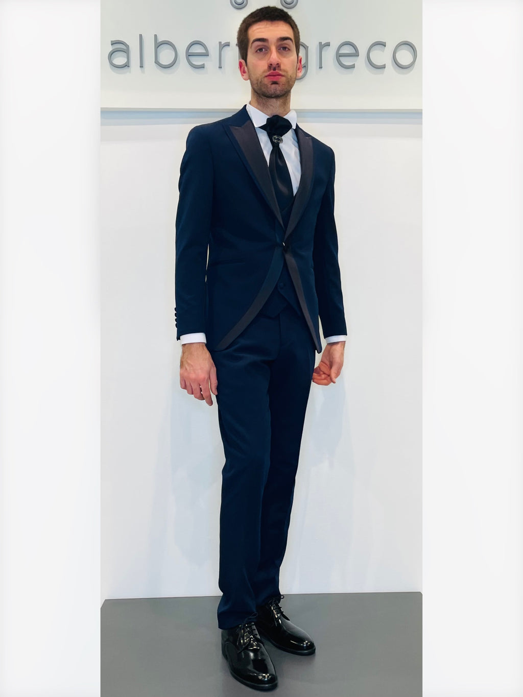 Completo cerimonia con giacca con rever con inserto in raso