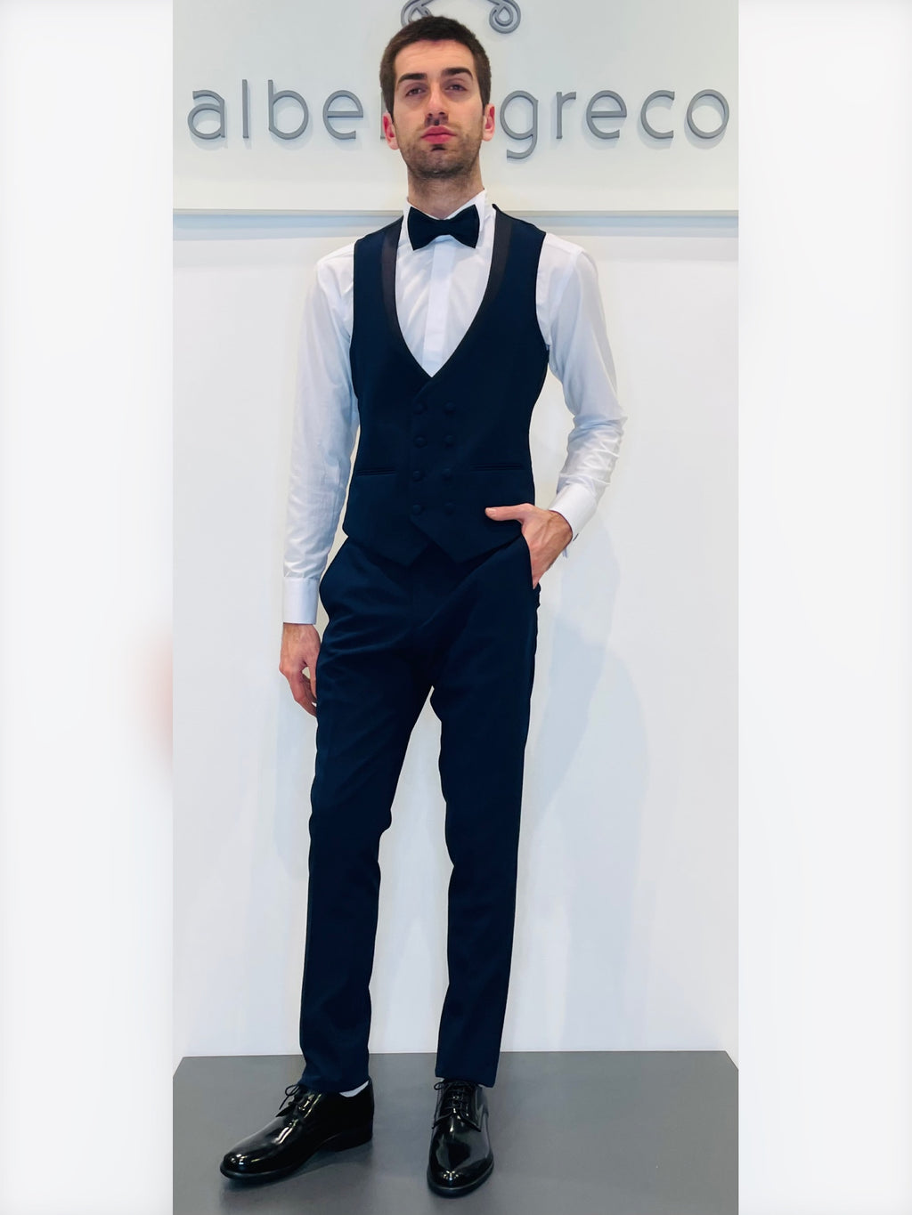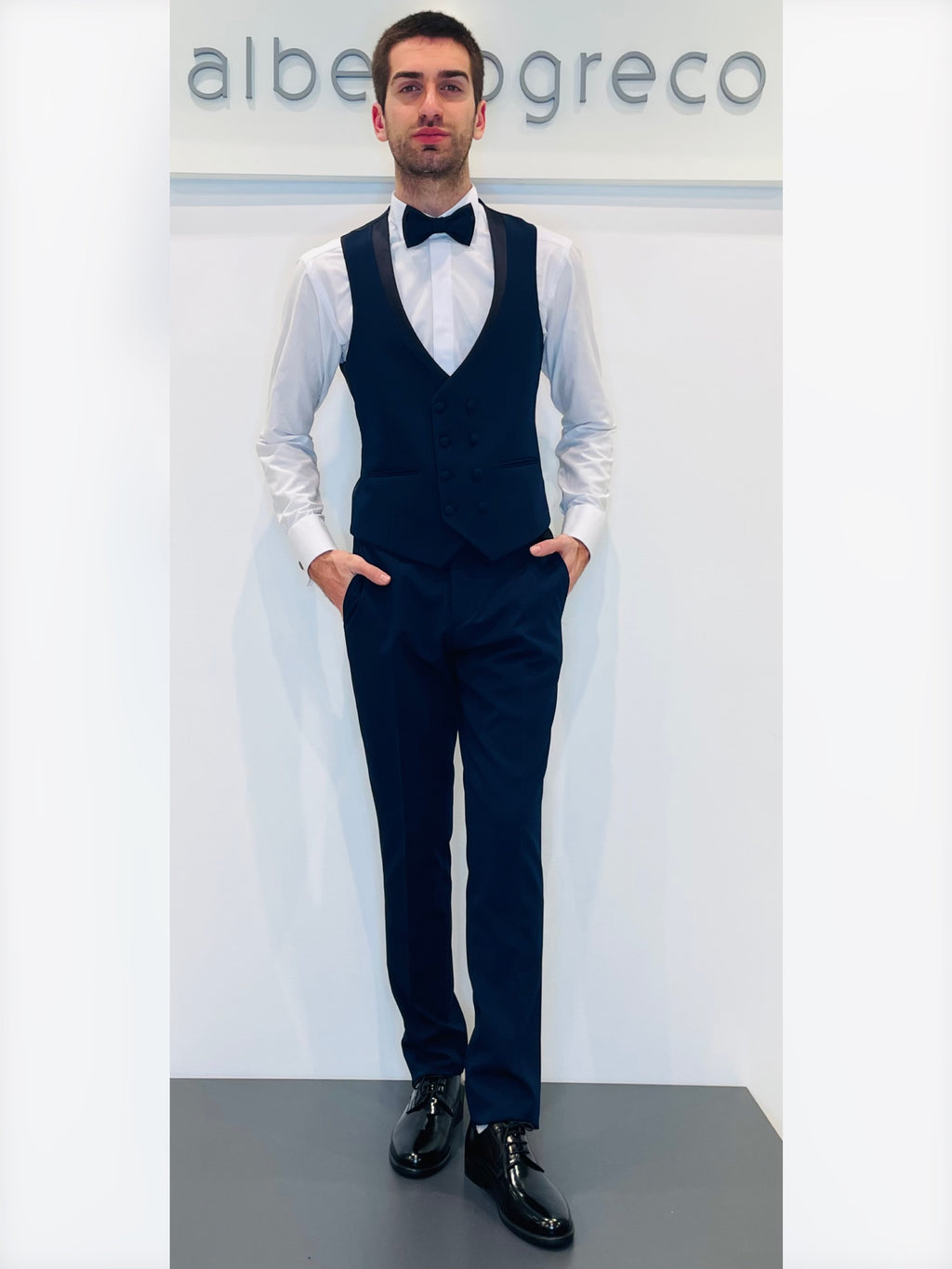 Completo formato da giacca stile mezzo tight, pantaloni e gile, cravattone o papillon