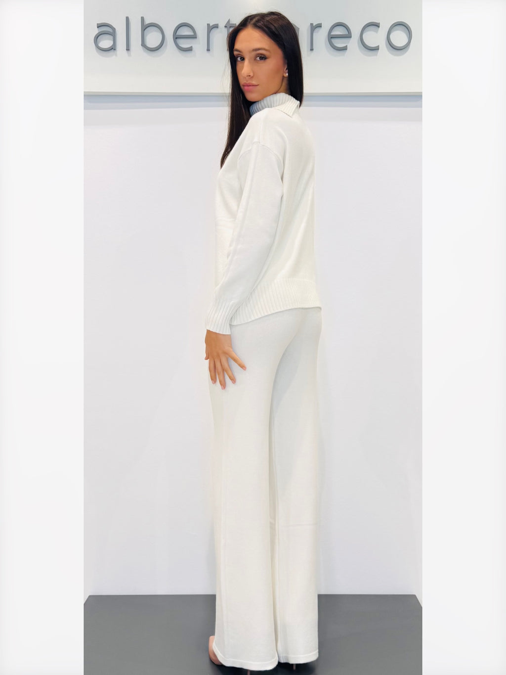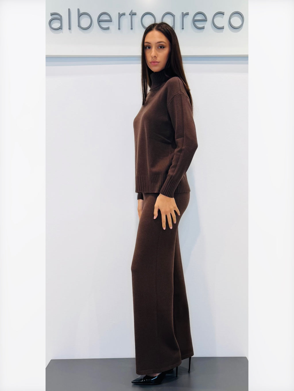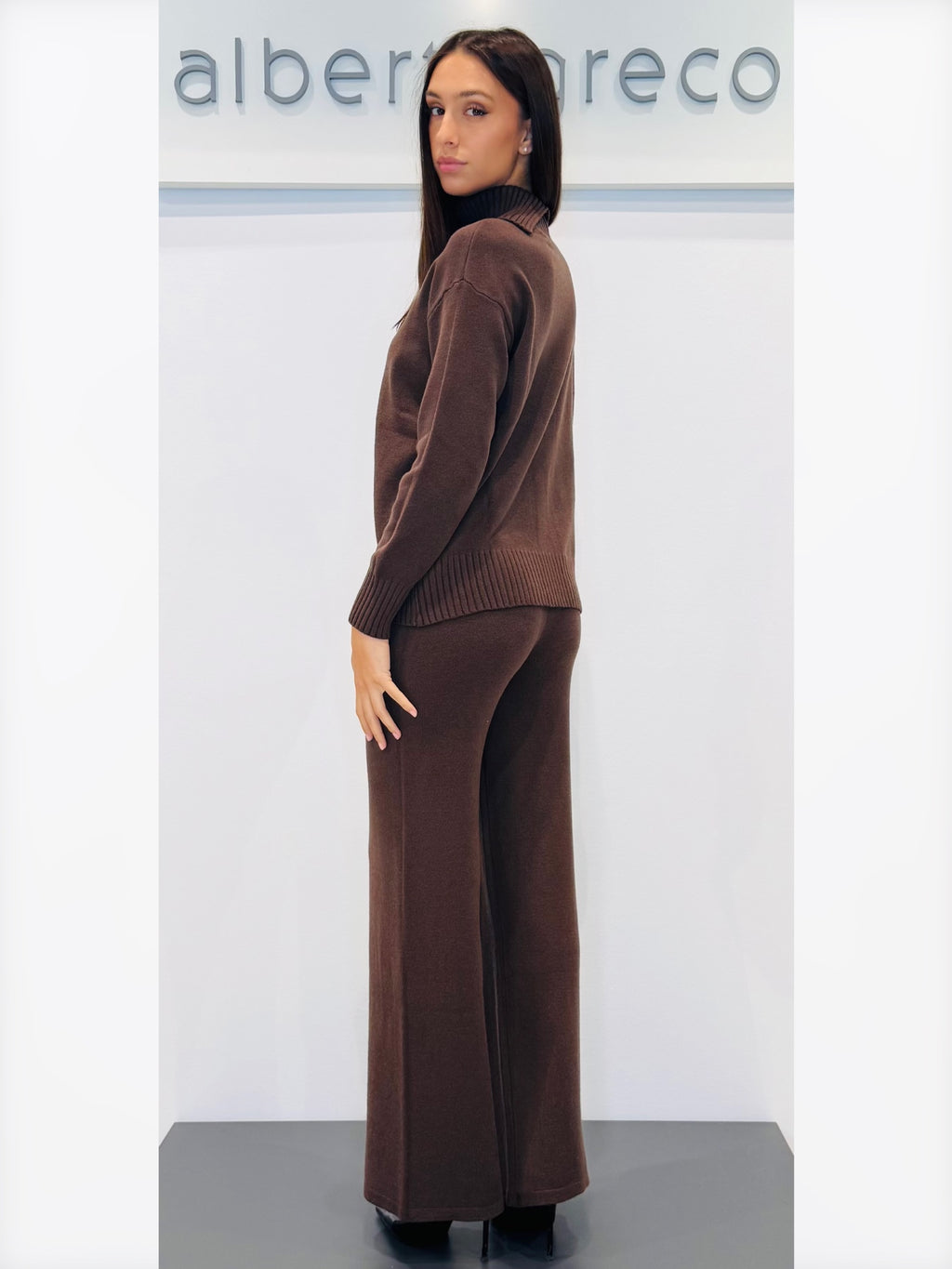 Coordinato maglia over dolcevita e pantaloniVestibilità over ampia, taglia unica con maniche lungheDolcevita con spacco dietro su scollo, con tasche e bordi laminati