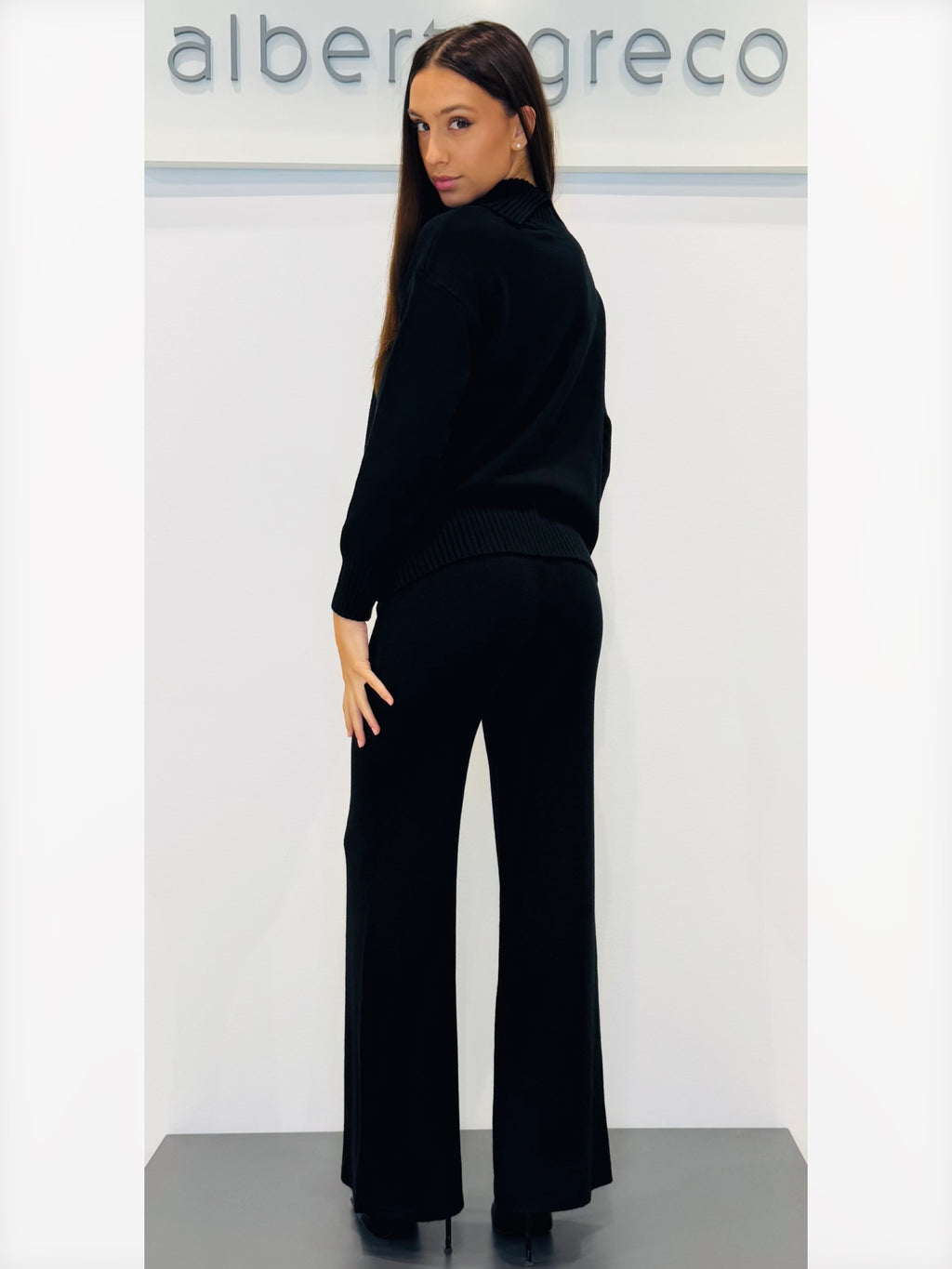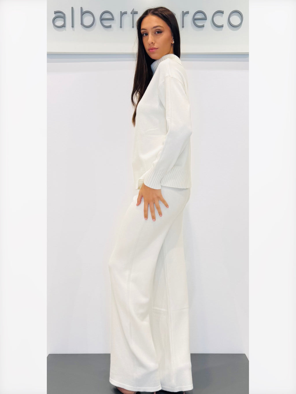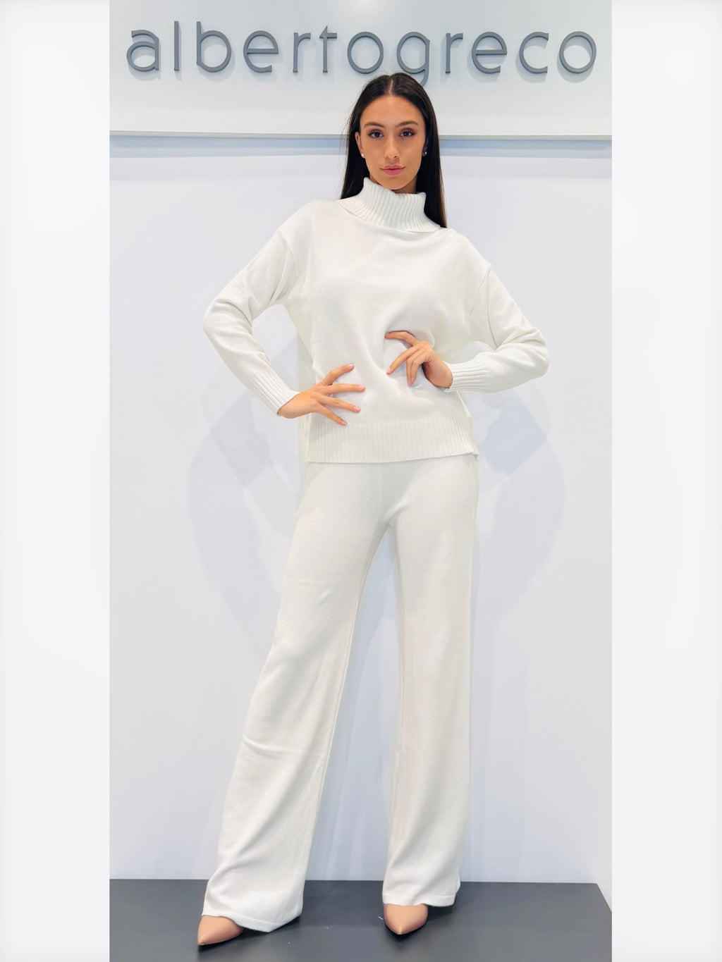 Coordinato maglia over dolcevita e pantaloniVestibilità over ampia, taglia unica con maniche lungheDolcevita con spacco dietro su scollo, con tasche e bordi laminati