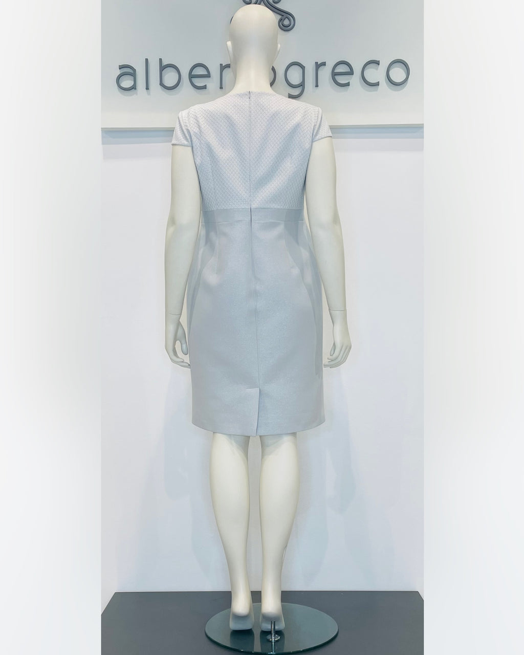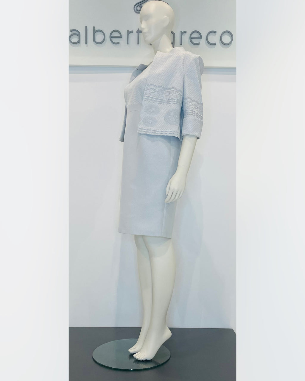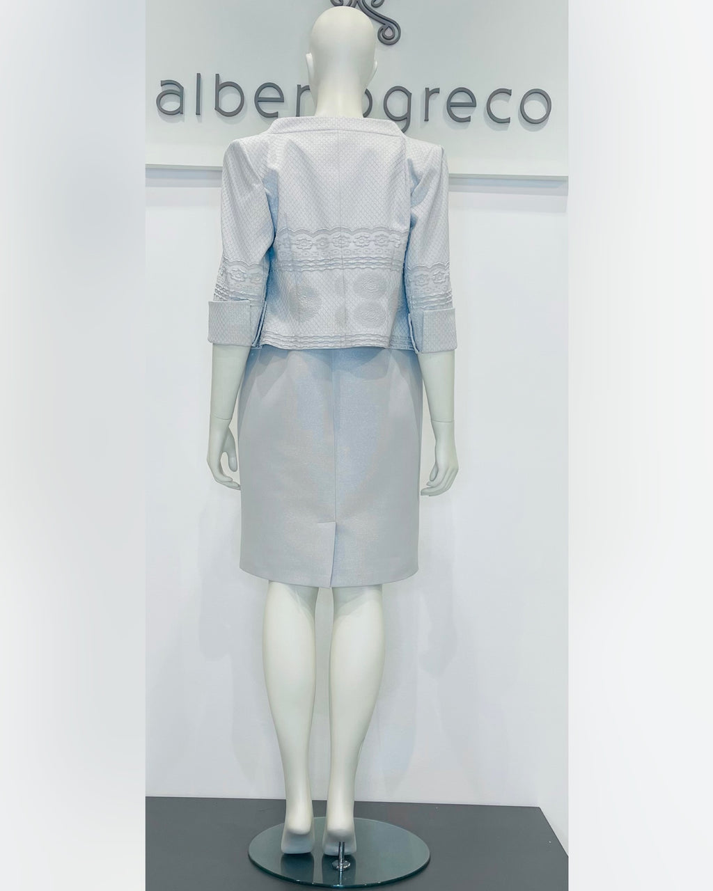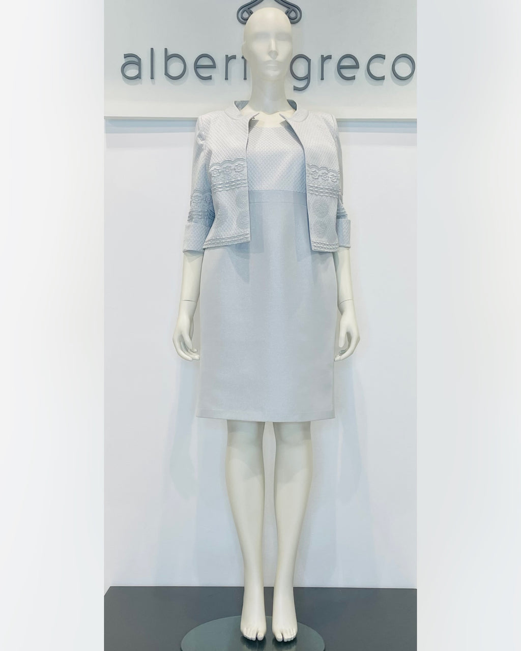 Completo formato da tubino con manica ad aletta e giacca con manica a tre quarti in tessuto damascato goffrato.
