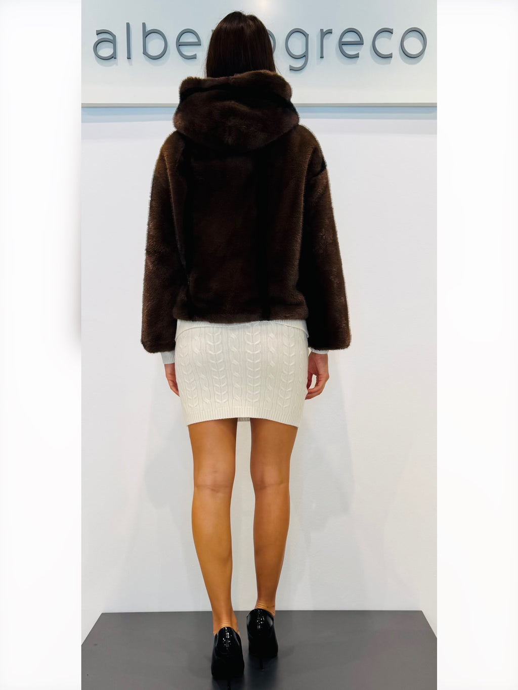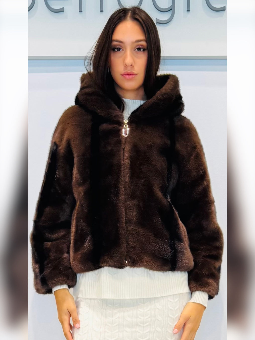 Eco pelliccia corta con cappuccioGiacca foderata lunga 58 cm per la taglia 42Vestibilità regolare ampiaTasche a scomparsaCollo a cappuccio con chiusura a zip in metalleria doratalavare a seccoTessuto esterno 100%PL Fodera 100%PL