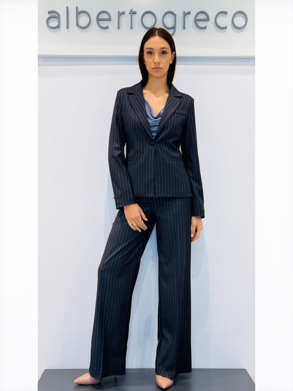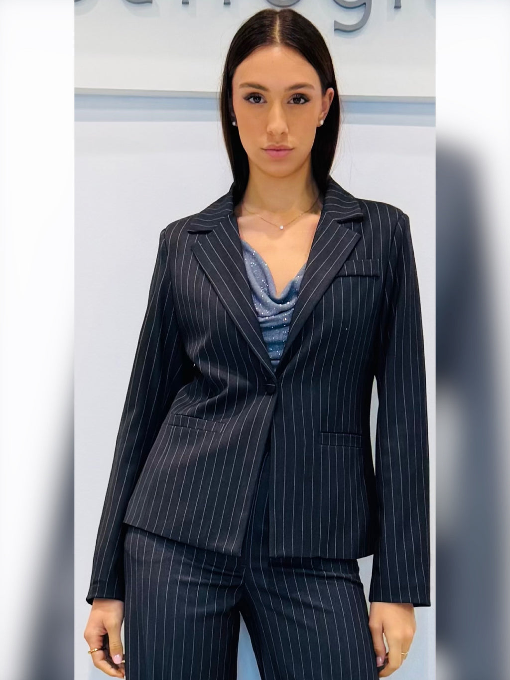 Giacca a gessata un bottoneGiacca con spallina strutturata Giacca foderataVestibilità regolareTasche a pistagna funzionaliScollo a rever, con un bottoneLavare a 30°Tessuto esterno 63%PL 34%VI 3%EA Fodera 100%PL