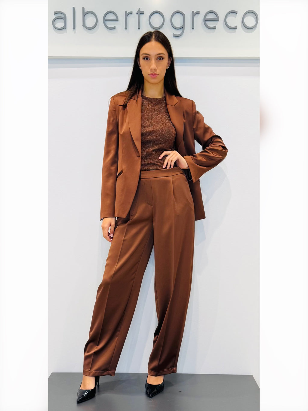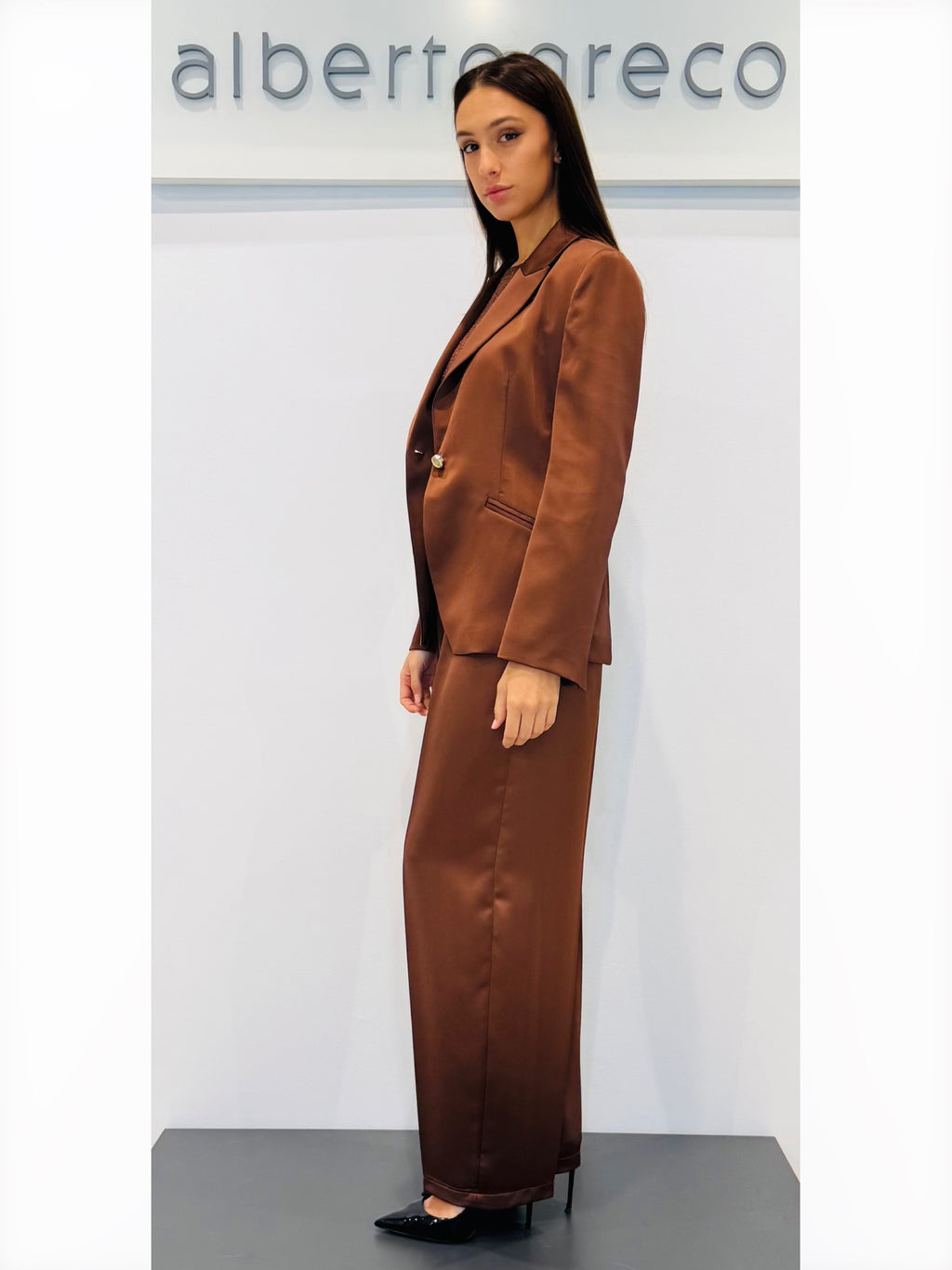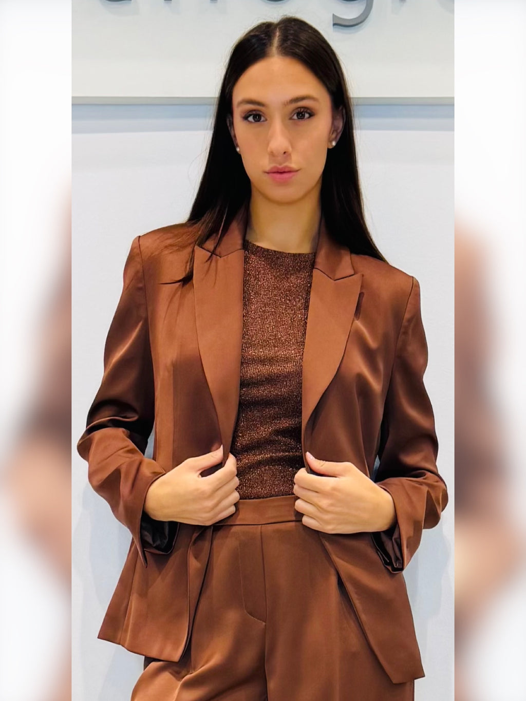 Giacca in raso un bottoneGiacca con spallinaGiacca foderataVestibilità overTasche a filettoScollo a rever con un bottoneLavare a seccoTessuto 100%PL