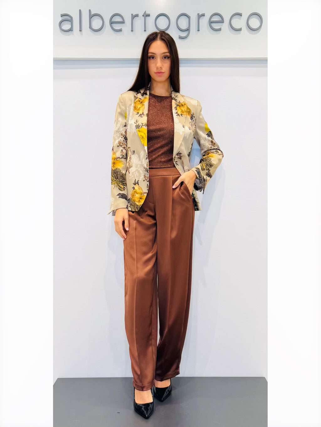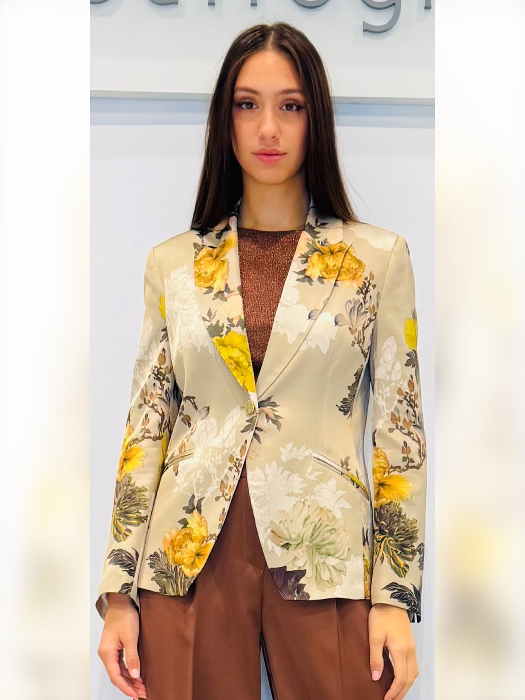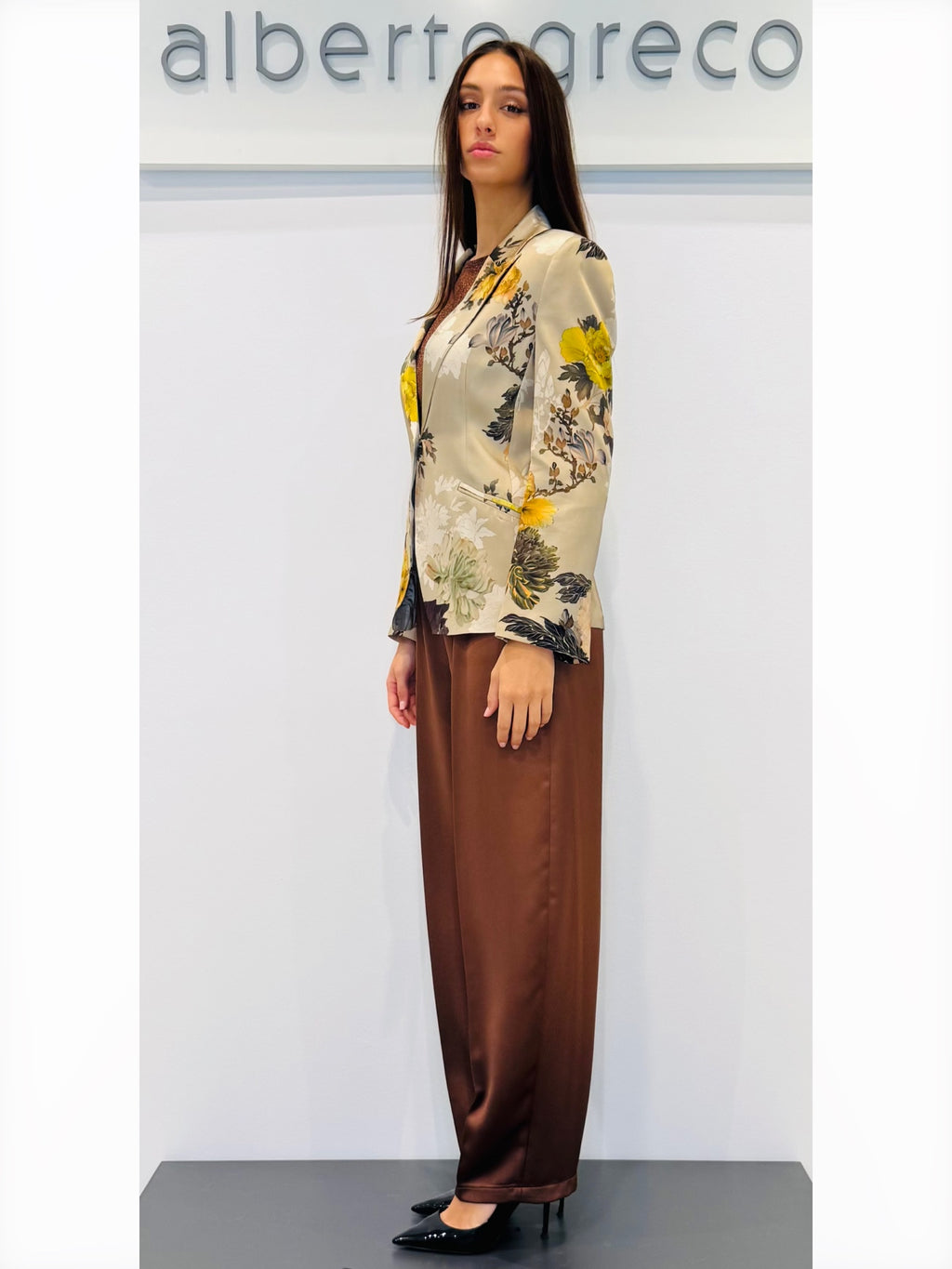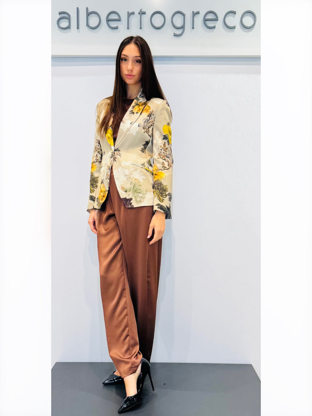 Giacca in raso fantasia un bottoneGiacca con spallinaGiacca foderataVestibilità overTasche a filettoScollo a rever con un bottoneLavare a seccoTessuto 100%VI Fodera 68%AC 32%PL