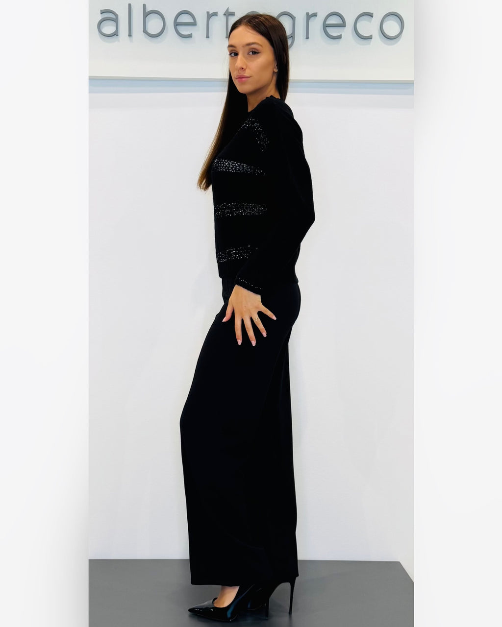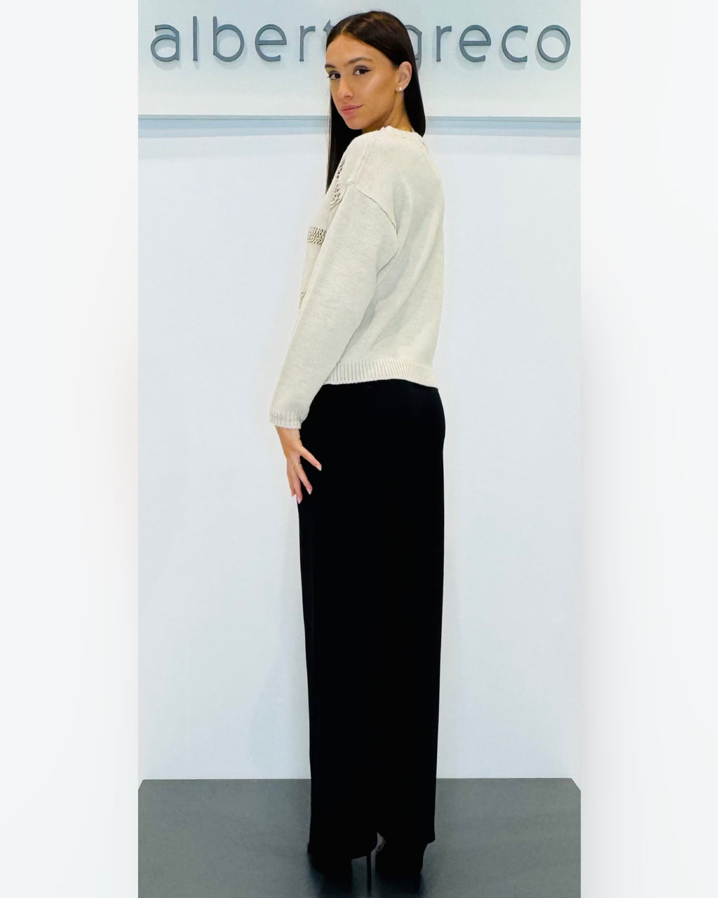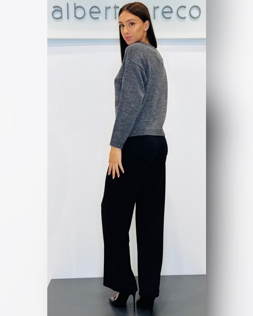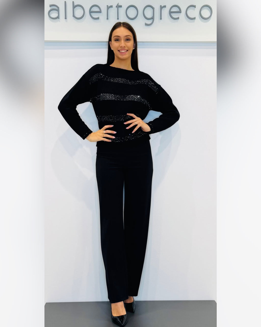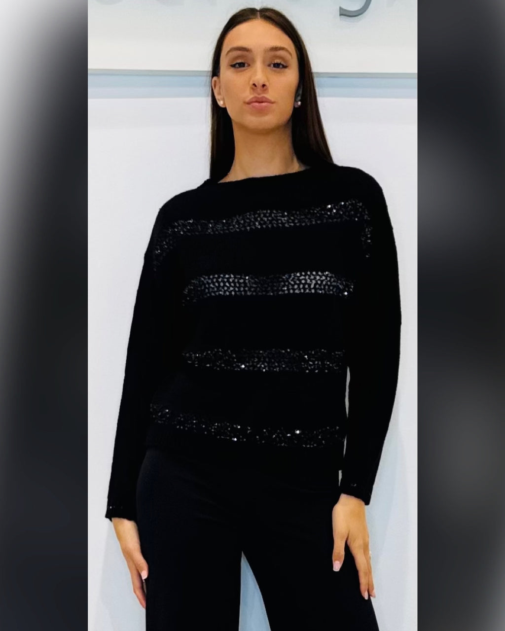 Maglia con lavorazione a jacquard con filato laminatoVestibilità ampia, con lavorazione jacquard effetto riga sfumataGirocollo Lavare a 30°Composizione: 45%VI 27%AC 14%PA 11%PL 3% WO