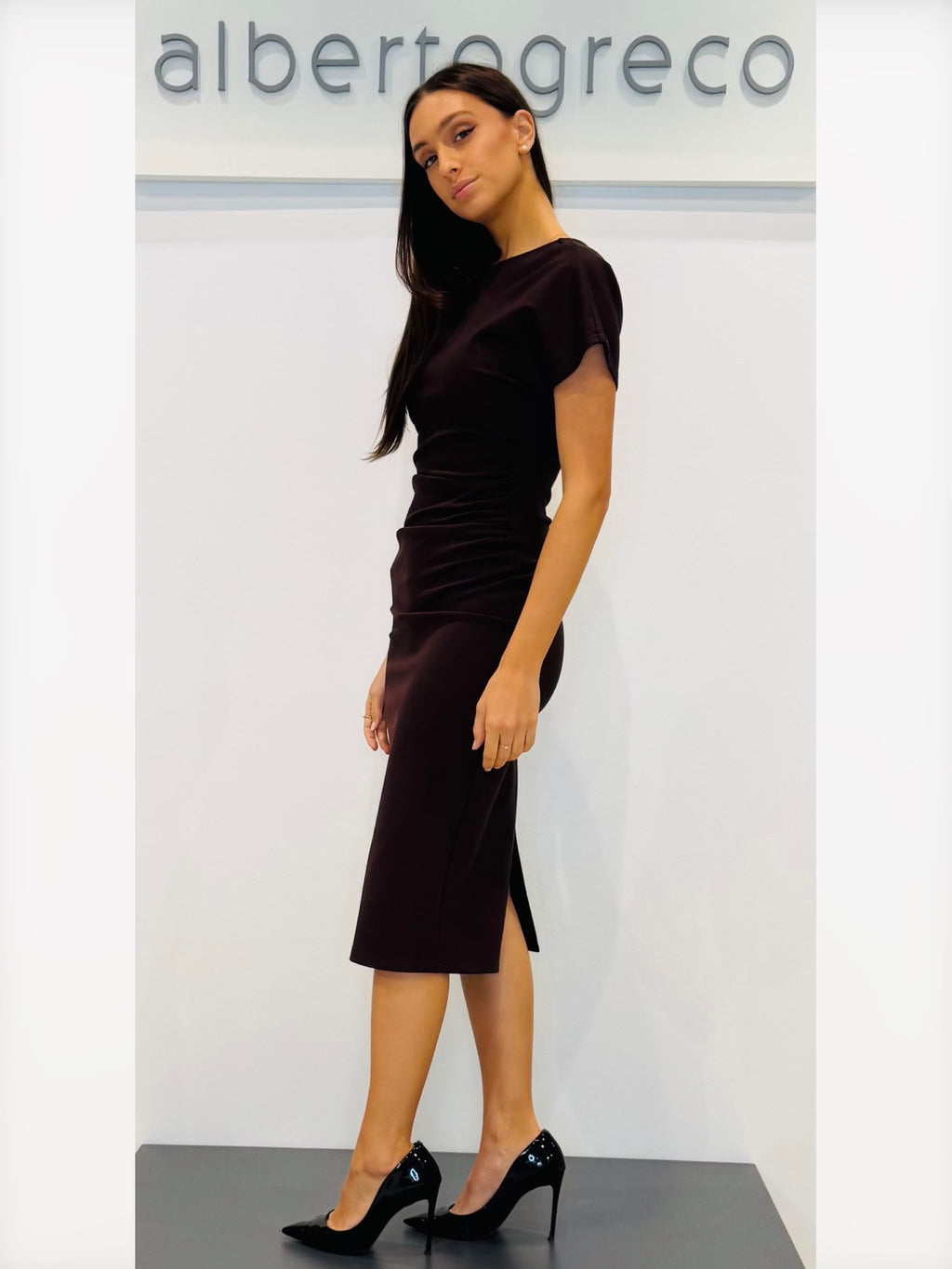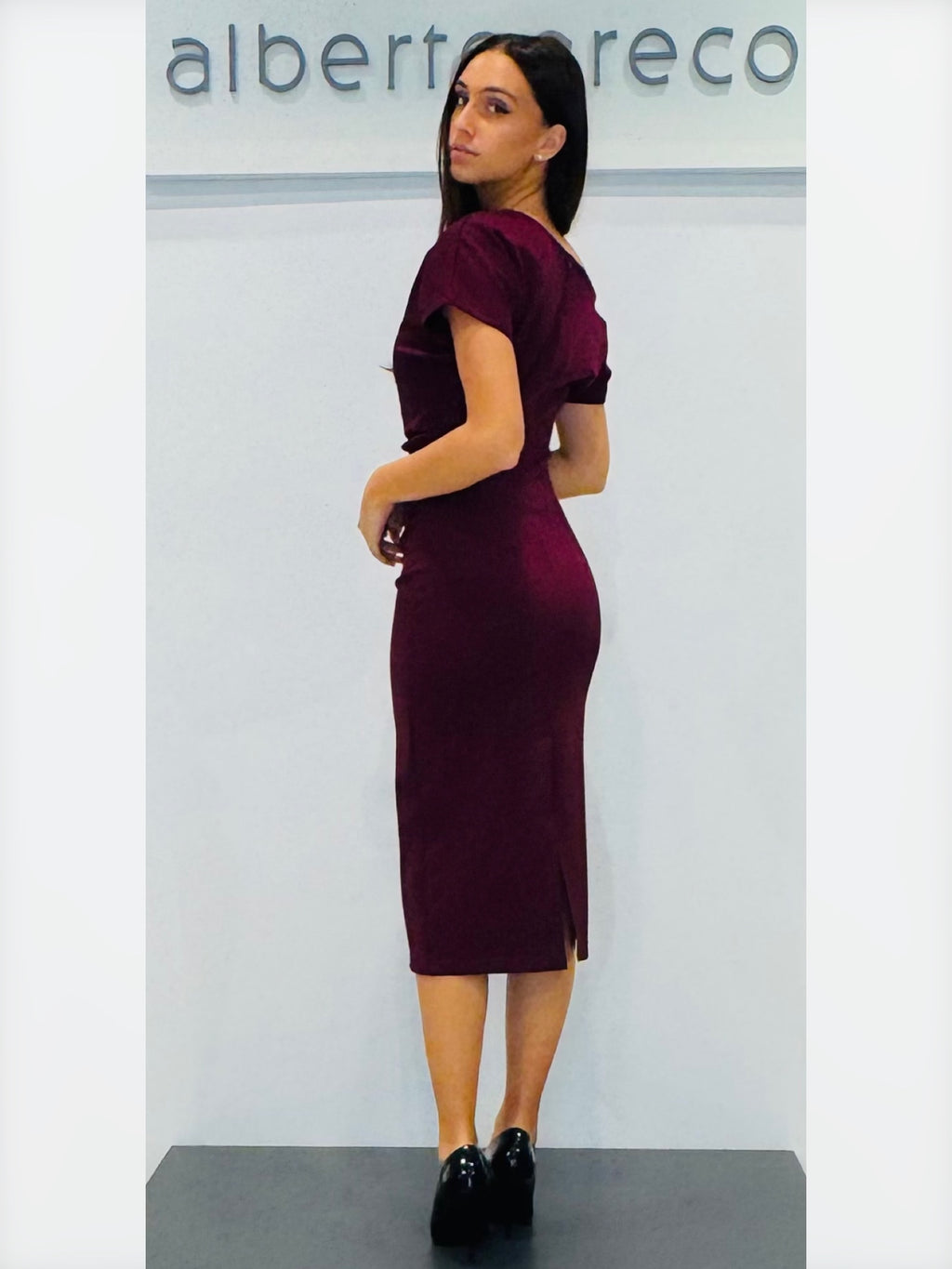 Vestibilità aderente, tessuto elasticizzato Girocollo, con spalla scesa e manica cortaGonna aderente con spacco centraleLavare a 30°Tessuto 65%VI 30%PA 5%EA