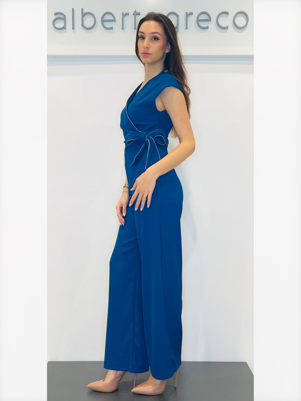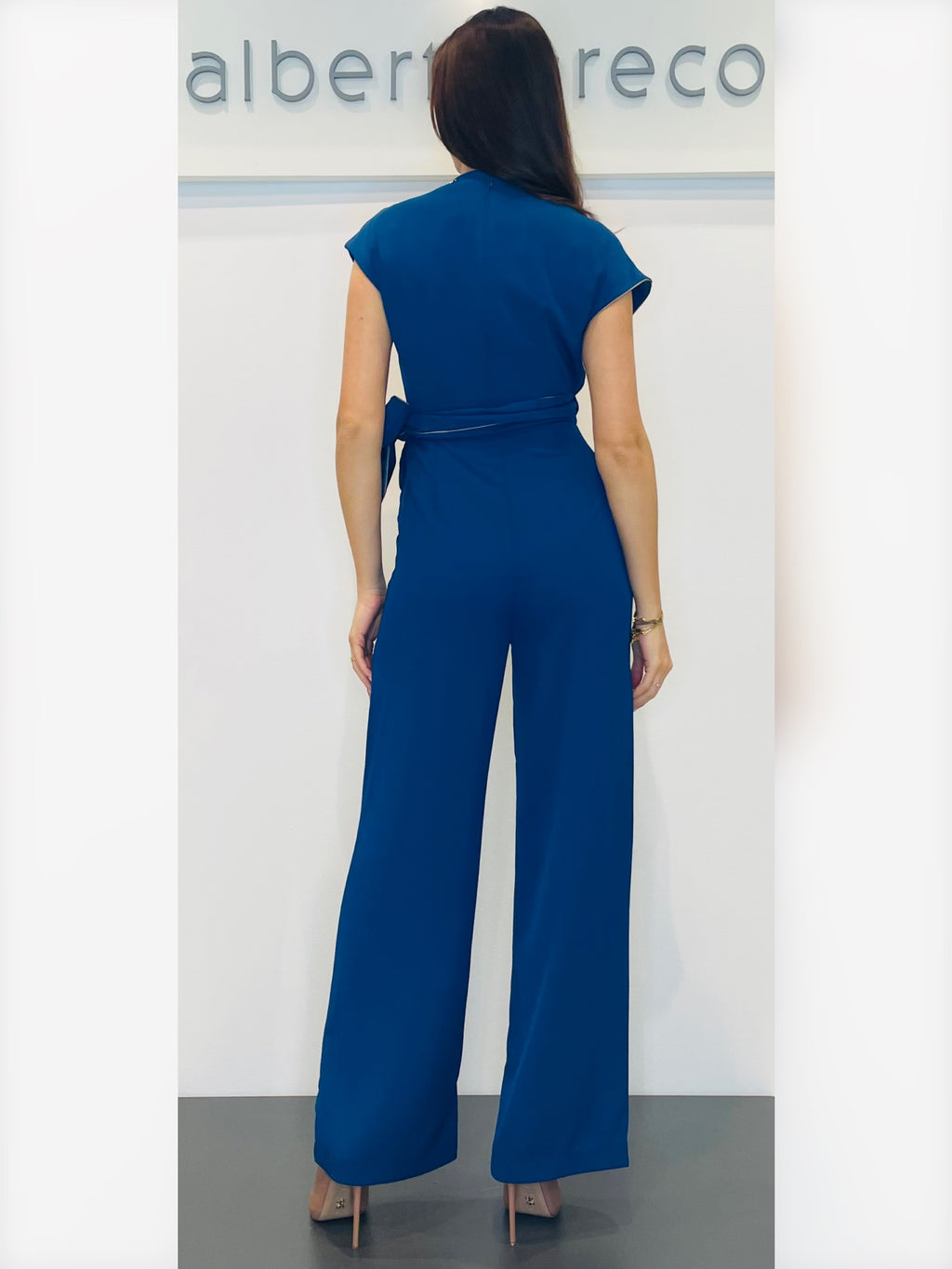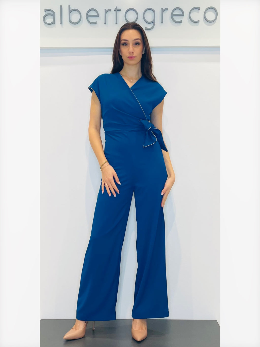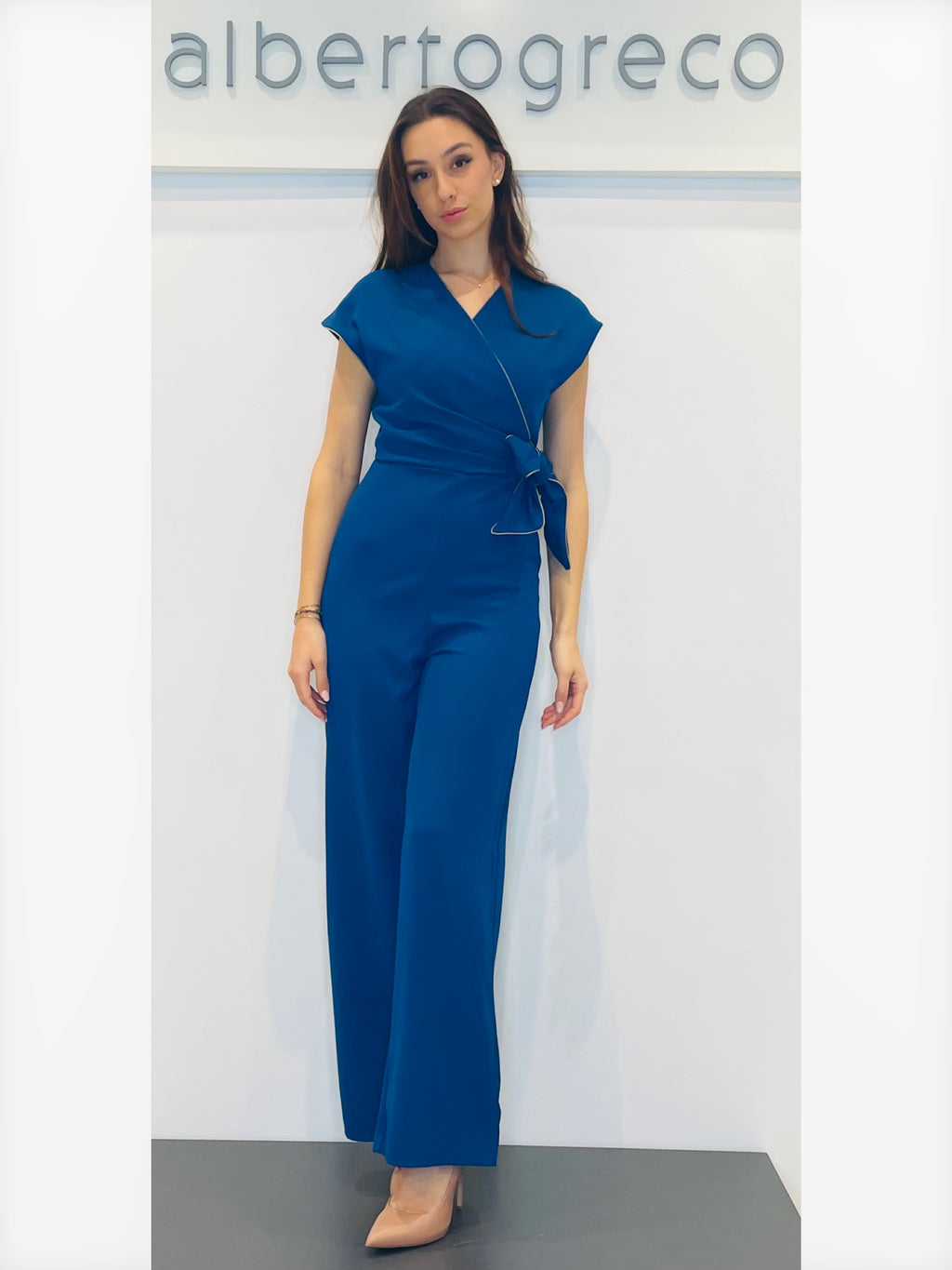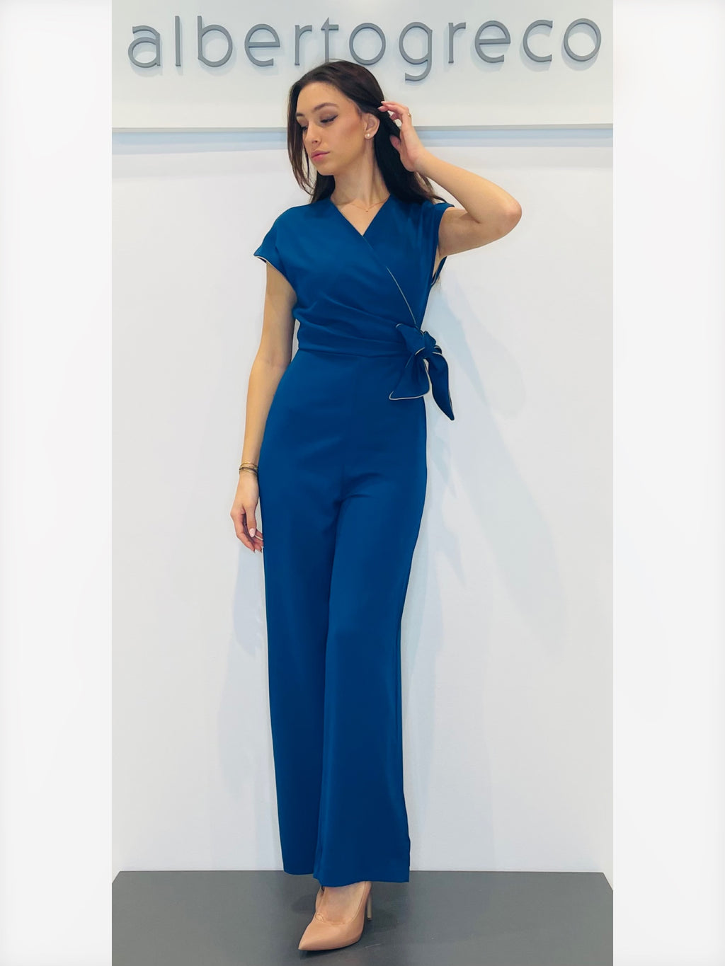 Tuta con motivo a nodo in vitaVestibilità regolare, tuta con manica corta spalla scesaScollo a V incrociato con bordino in contrasto, motivo in vita a nodo Pantaloni ampi Zip nel centro dietroLavare a seccoTessuto 96%PL 4%EA